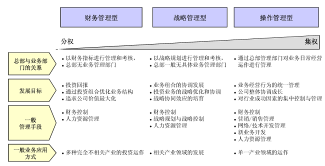 管控模式根據(jù)集分權程度,一般分為財務管控型、戰(zhàn)略管控型和操作管控型,如下圖所示: