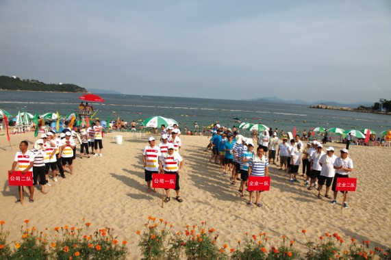比賽越來越精彩,競爭越來越激烈。最后一個項目是障礙接力。這項比賽刺激好玩,氣氛活躍,觀賞性強,對運動員的個人體能及技術(shù)提出了較高的要求,對團(tuán)隊協(xié)作完成任務(wù)的能力也是一個考驗。隨著主持人一聲令下,運動員們迅速奔向海邊取水,不顧“濕身”,控制好的就來個“蜻蜓點水”,控制稍遜的就直接和大海來個“擁抱”。返回的時候是要吃點苦頭的,面對不足一米高的障礙網(wǎng),有匍匐前進(jìn)的,有奮力爬行的,有蹲著挪移的,“洋相”盡出,令人捧腹。賽場上高潮迭起,戰(zhàn)火彌漫,場邊觀眾笑聲、加油聲、歡呼聲、喝彩聲響成一片,熱鬧非凡。經(jīng)過激烈的角逐,企業(yè)一隊拔得頭籌,公司一隊、公司二隊、企業(yè)二隊分獲二、三、四名。