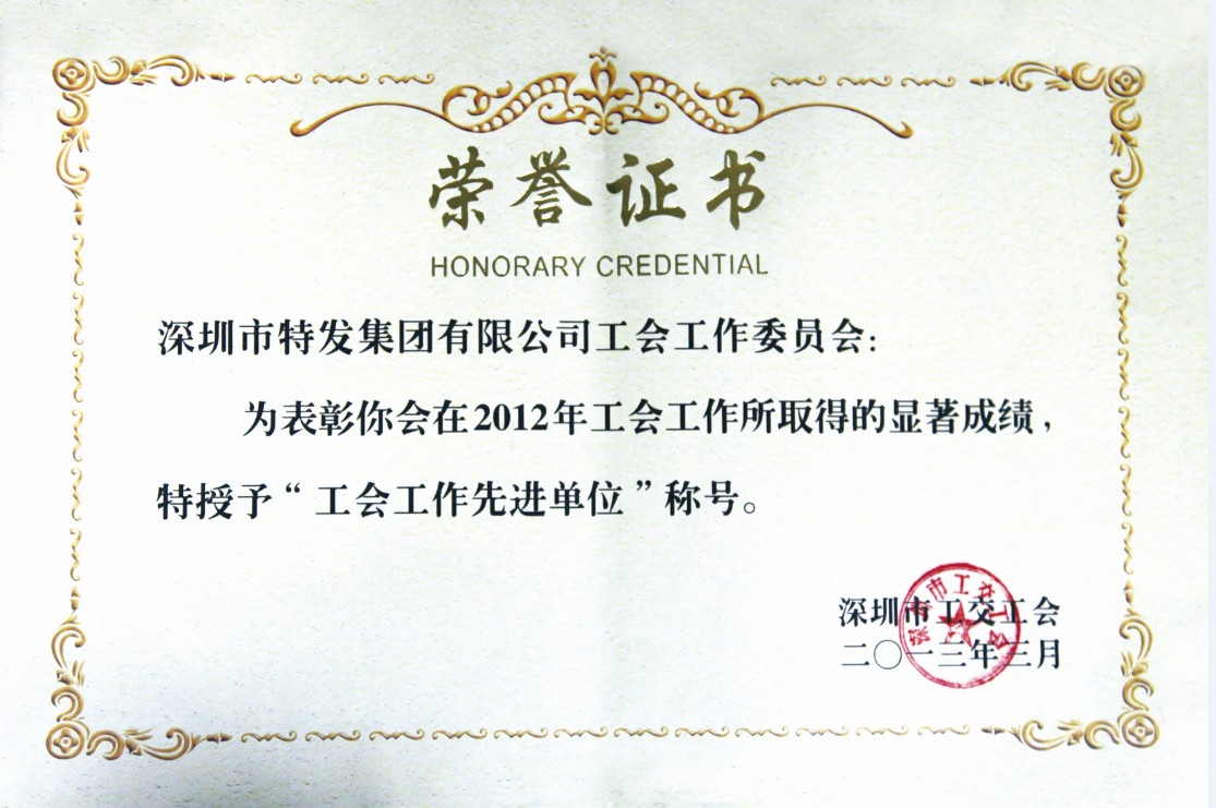 2013年3月,集團(tuán)工委會獲深圳市工交工會授予2012年度“工會工作先進(jìn)單位”稱號。同時,系統(tǒng)企業(yè)特力集團(tuán)紀(jì)昌建、特發(fā)物業(yè)公司姜海忠獲市工交工會“優(yōu)秀工會工作者”稱號;特發(fā)信息李彬?qū)W、特發(fā)地產(chǎn)唐大平獲得市工交工會“優(yōu)秀職工之友”稱號;集團(tuán)總部岳紅瓊、特發(fā)黎明;蹖帿@市工交工會“優(yōu)秀工會積極分子”稱號。