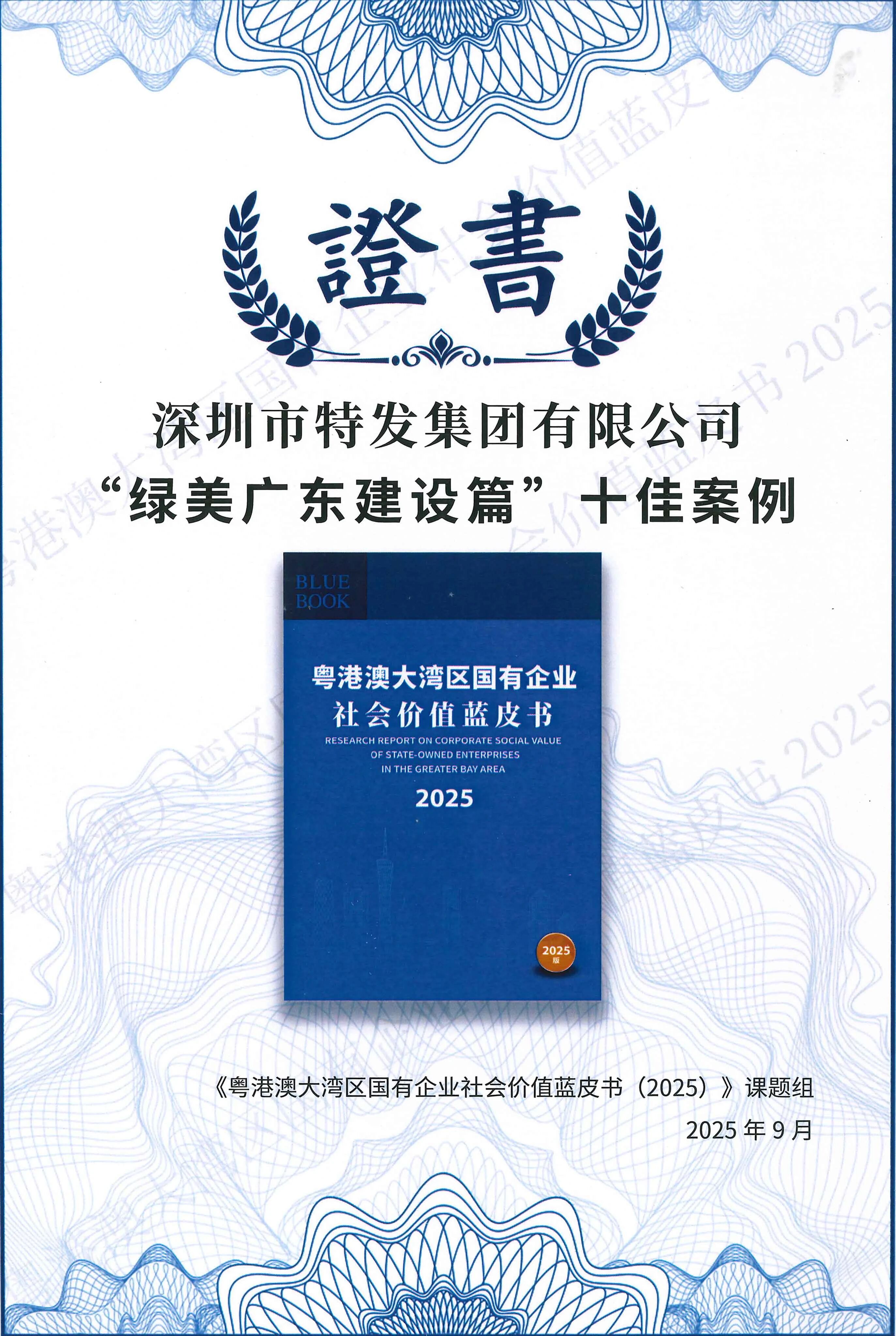 會上,特發(fā)集團申報的《踐行綠色低碳理念 以科技創(chuàng)新驅動企業(yè)高質量可持續(xù)發(fā)展》案例,成功入選由廣東省國資委發(fā)布的《粵港澳大灣區(qū)國有企業(yè)社會價值藍皮書 (2025)》“綠美廣東建設篇”十佳案例。