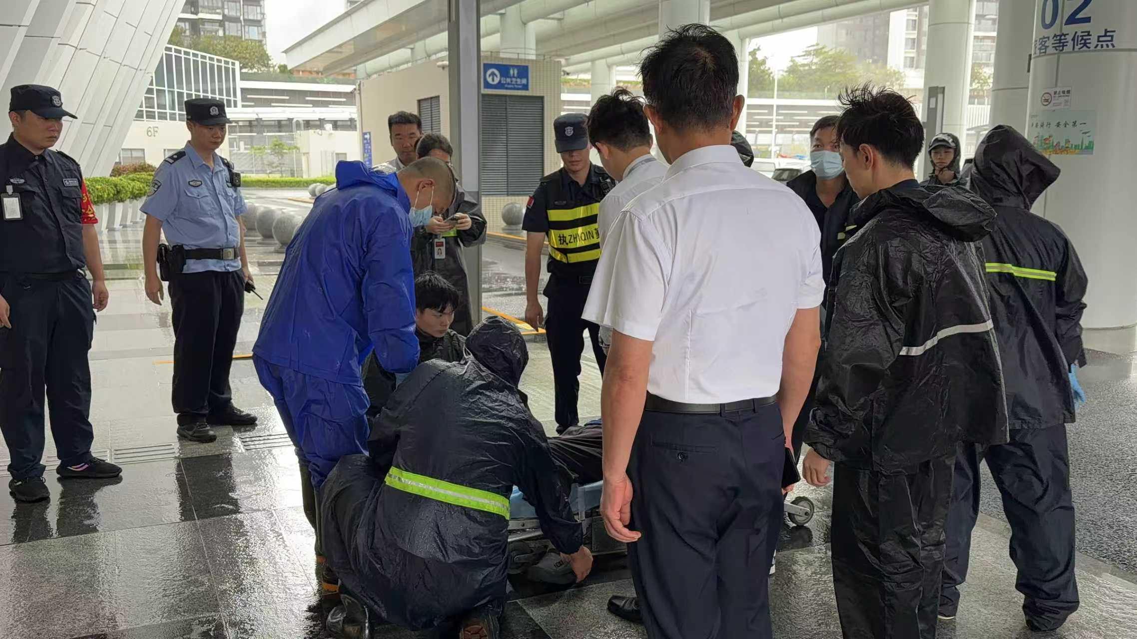 24日10時(shí),特發(fā)服務(wù)下屬口岸公司在蓮塘口岸二樓入境大廳接到緊急求助,兩名旅客中一人因腰部摔傷,出現(xiàn)嘔吐、呼吸困難癥狀且需坐輪椅就醫(yī)。面對(duì)“五!逼陂g的交通困境,現(xiàn)場(chǎng)保安隊(duì)員第一時(shí)間呼叫增援并撥打120,3分鐘內(nèi)值班崗、醫(yī)療協(xié)助崗等多崗位人員迅速到位,一邊穩(wěn)定旅客情緒、詳細(xì)了解傷情以精準(zhǔn)對(duì)接急救中心;等待期間為通關(guān)人員主動(dòng)提供雨衣、飲用水和食品,在臺(tái)風(fēng)呼嘯的窗外,用高效協(xié)作與暖心服務(wù)搭建起生命通道。